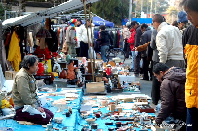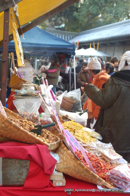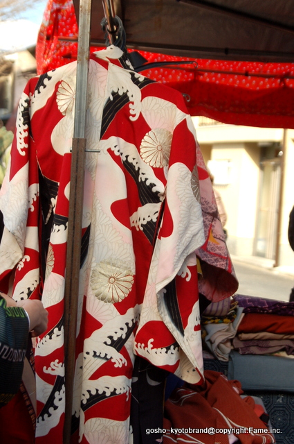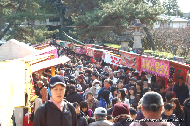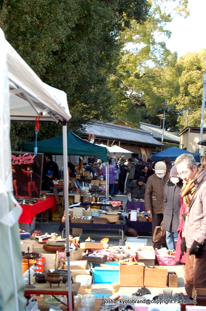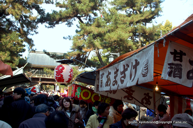 露店は例月以上に多く植木・骨董・古着・衣料品などを商う店が新春の縁日の賑わいをみせる。