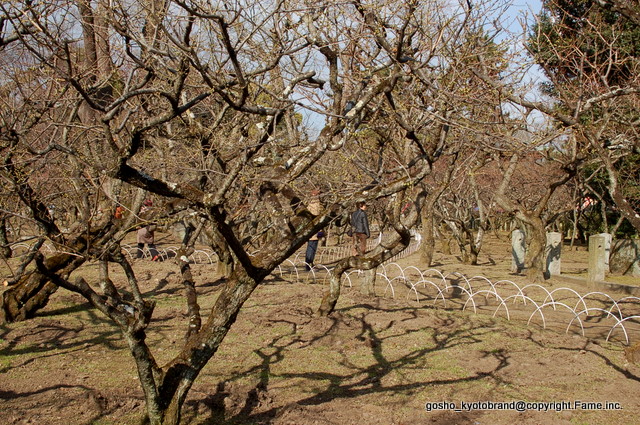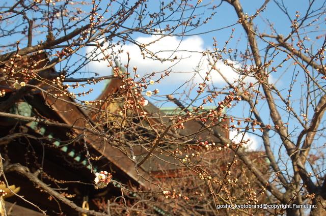 受験シーズンで合格祈願の親子連れも目立ち、梅苑公開前の早咲きの梅をと観梅の人も続く。