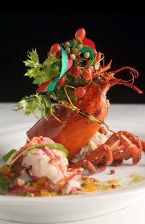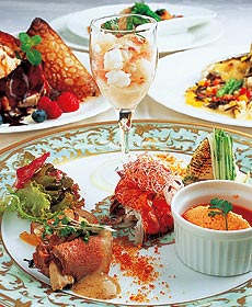 (左) オードブル、オマールエビとやわらかな明石タコのサラダ3種のソース。スペシャルディナーは13,860円(税、サ込)。