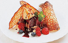 とろとろ感がたまらない、若狭の甘鯛とヤリイカとウニとキャビアのコンソメジュレ添え(左) カシス&紅茶の酸味と甘味が絶妙なアレキサンドライトの羽根とクリームブリュレ(右) もう堪らないほどの食欲がかきたてられる本場フランス仕込みの正統派フレンチである。