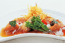 (右) 三大珍味の饗宴たるいろいろなオードブルのクルリテなど。