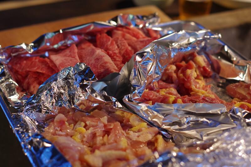 ・牛焼肉BBQプラン:牛・豚・鶏肉セット、カット野菜