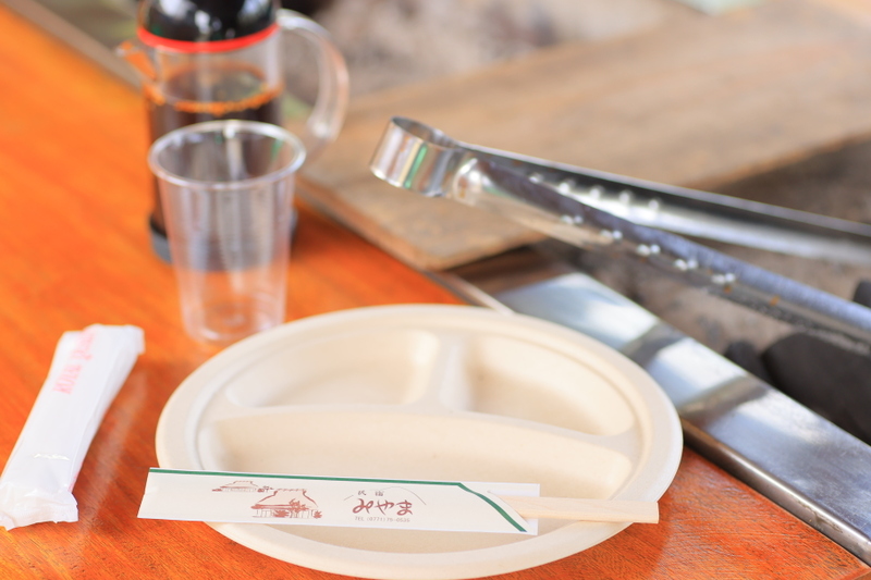 炭、網、火ばさみ、トング、皿、コップ、箸、お手拭き