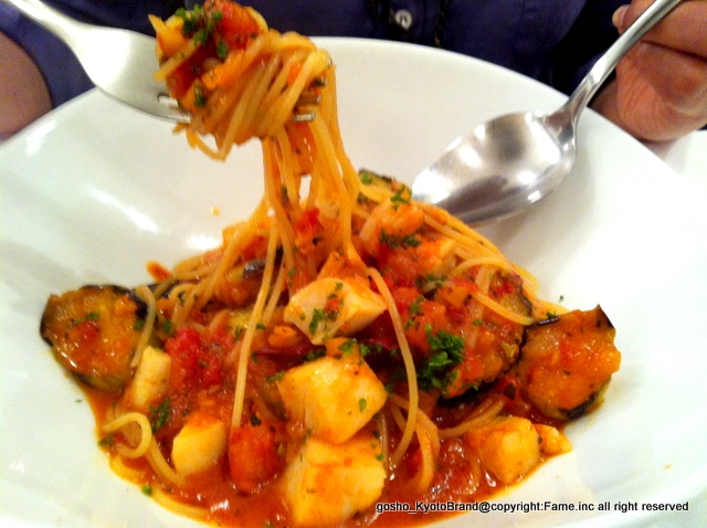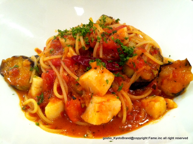 パスタの日替わりは、揚げ茄子に帆立の具がどっさりと入り、