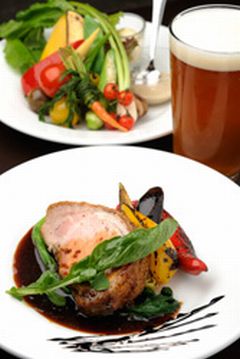 インディアペールエールのソースを添えたローストポーク1,350円と、オーガニック野菜のパーニャカウダ760円。